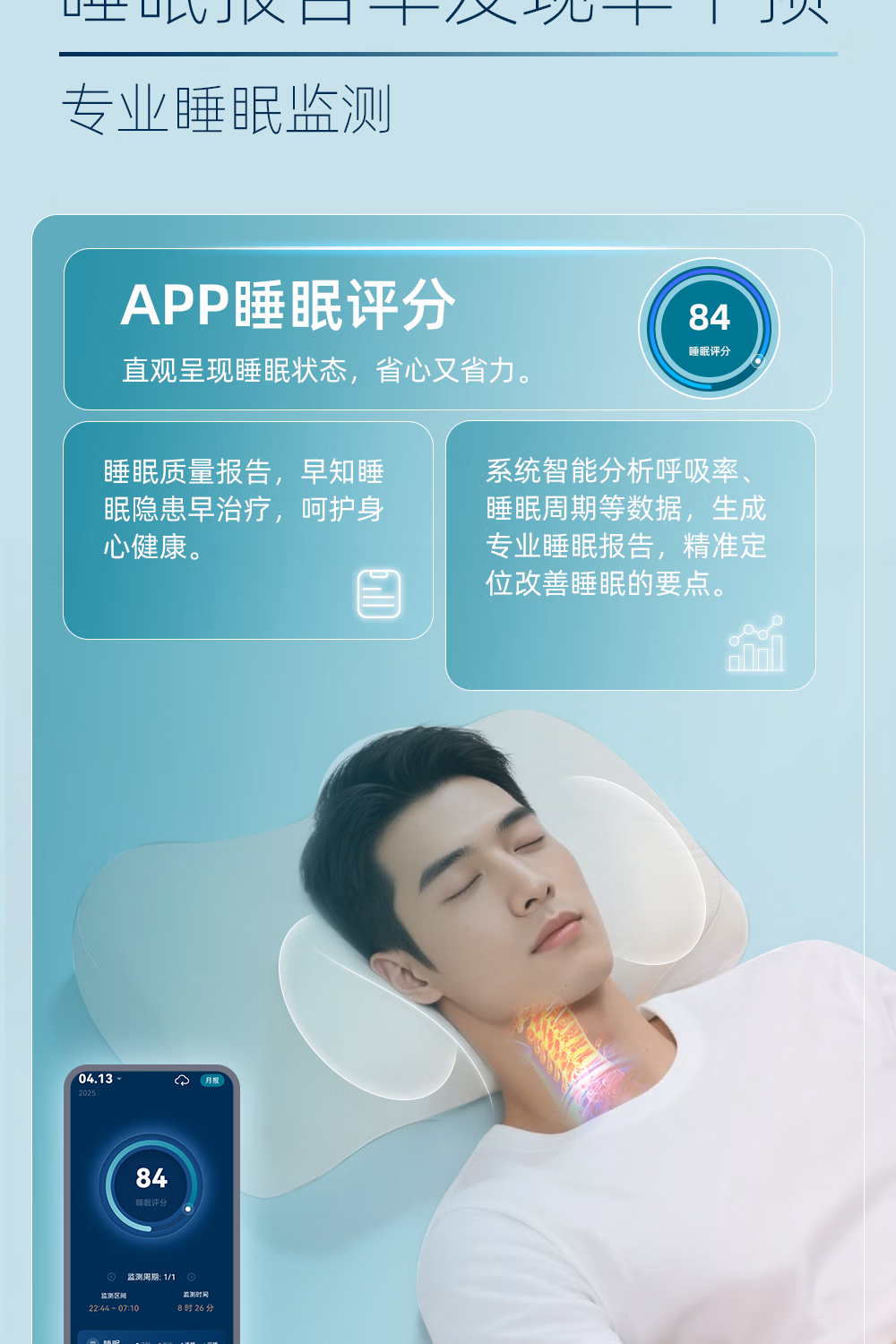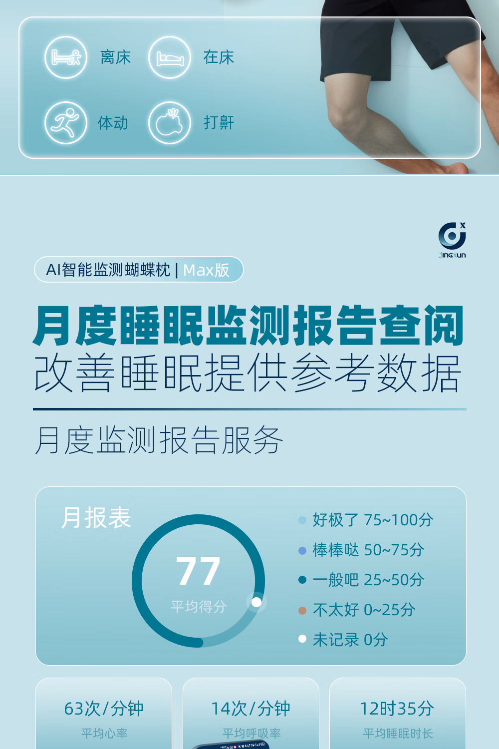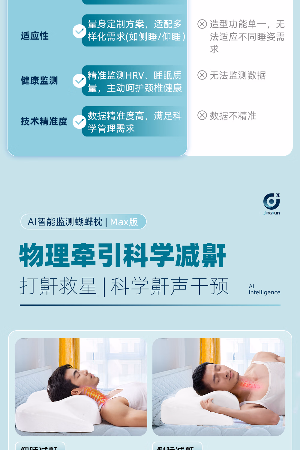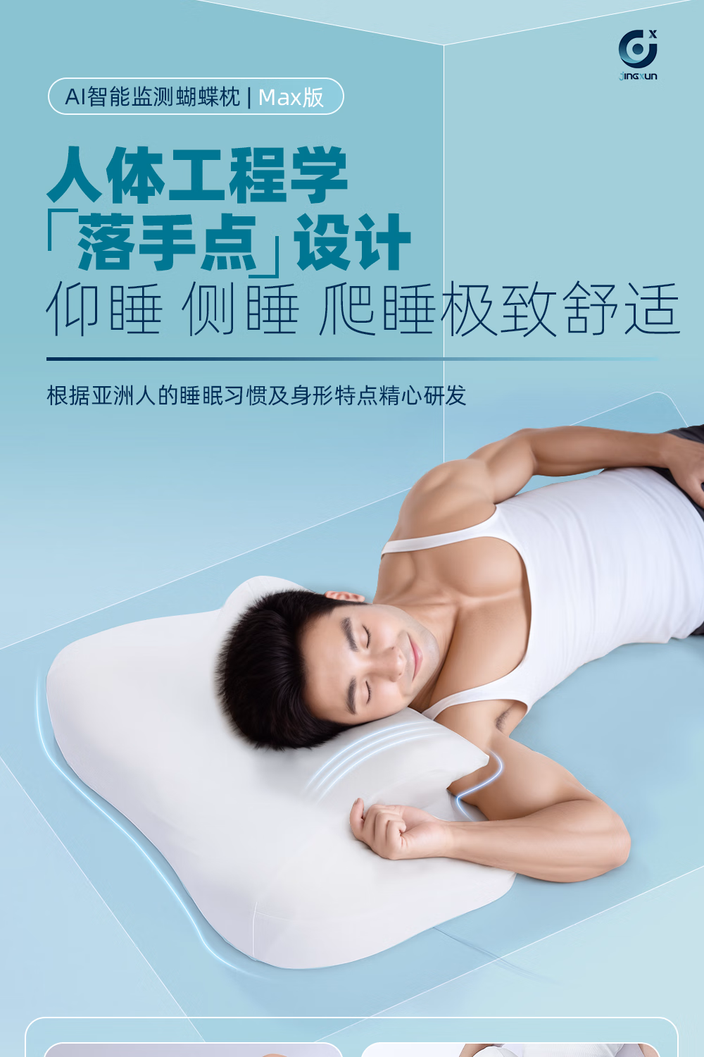 精询智能枕头AI助深度睡眠记忆棉护颈椎无感心率血氧监测枕芯侧睡枕头 男款特高蝴蝶枕